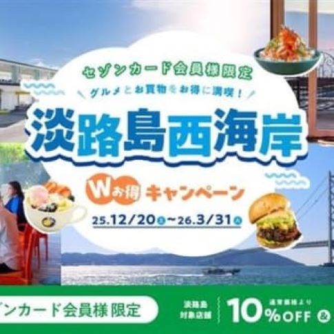【セゾンカード会員限定の大特典旅!】淡路島西海岸 Wお得キャンペーン「オーシャンテラス」をはじめ淡路島西海岸施設では、セゾンカード会員様限定で、淡路島の美しいオーシャンビューや…2026.01.27 -