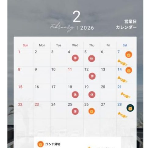 【営業カレンダー】2月オーシャンテラスいつもオーシャンテラスをご利用いただき、誠にありがとうございます。 2月の営業についてご案内申し上げま…2026.01.31 -