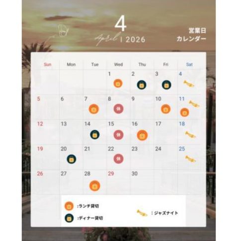 4月営業カレンダーいつもオーシャンテラスをご利用いただき、誠にありがとうございます。4月の営業についてご案内申し上げます。 …2026.04.01 -